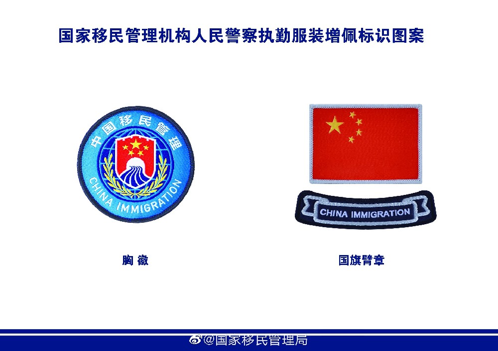 据国家移民管理局有关负责人介绍,国家移民管理机构人民警察按照《公安机关人民警察内务条令》规范着装、佩戴警衔警号等警用标志,同时根据移民管理执法执勤需要,在执勤服装上增佩中国移民管理标志胸徽和国旗臂章。中国移民管理标志胸徽位于警号正上方,国旗臂章位于执勤服装左臂位置,公安臂章位于执勤服装右臂位置。国家移民管理机构人民警察执勤服装增佩标识,有利于中外人员及时准确识别、自觉服从配合执法、方便求助服务,有利于移民管理人民警察主动接受广大人民群众监督,不断增强职业荣誉感,更好地履行法律赋予的职责任务。